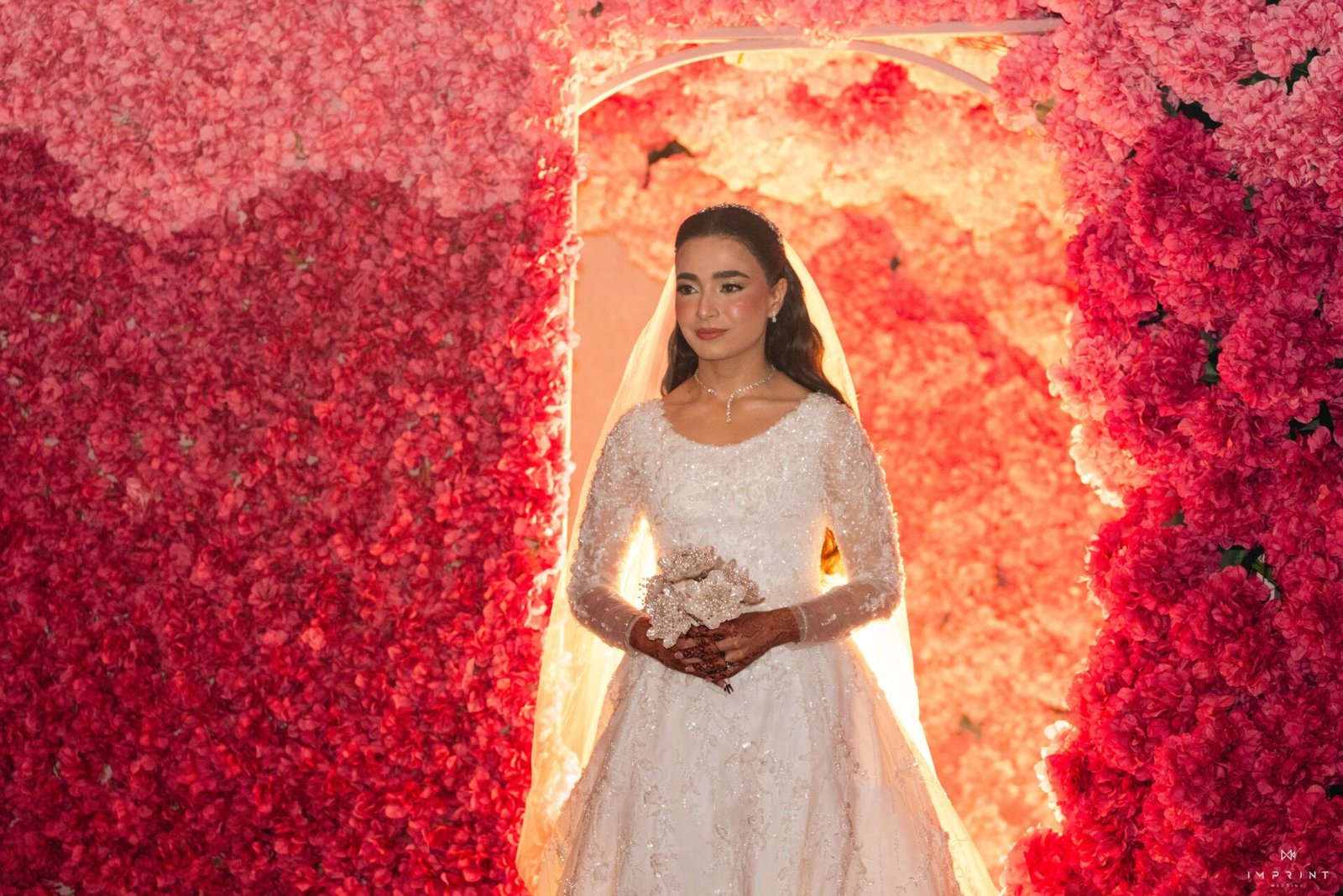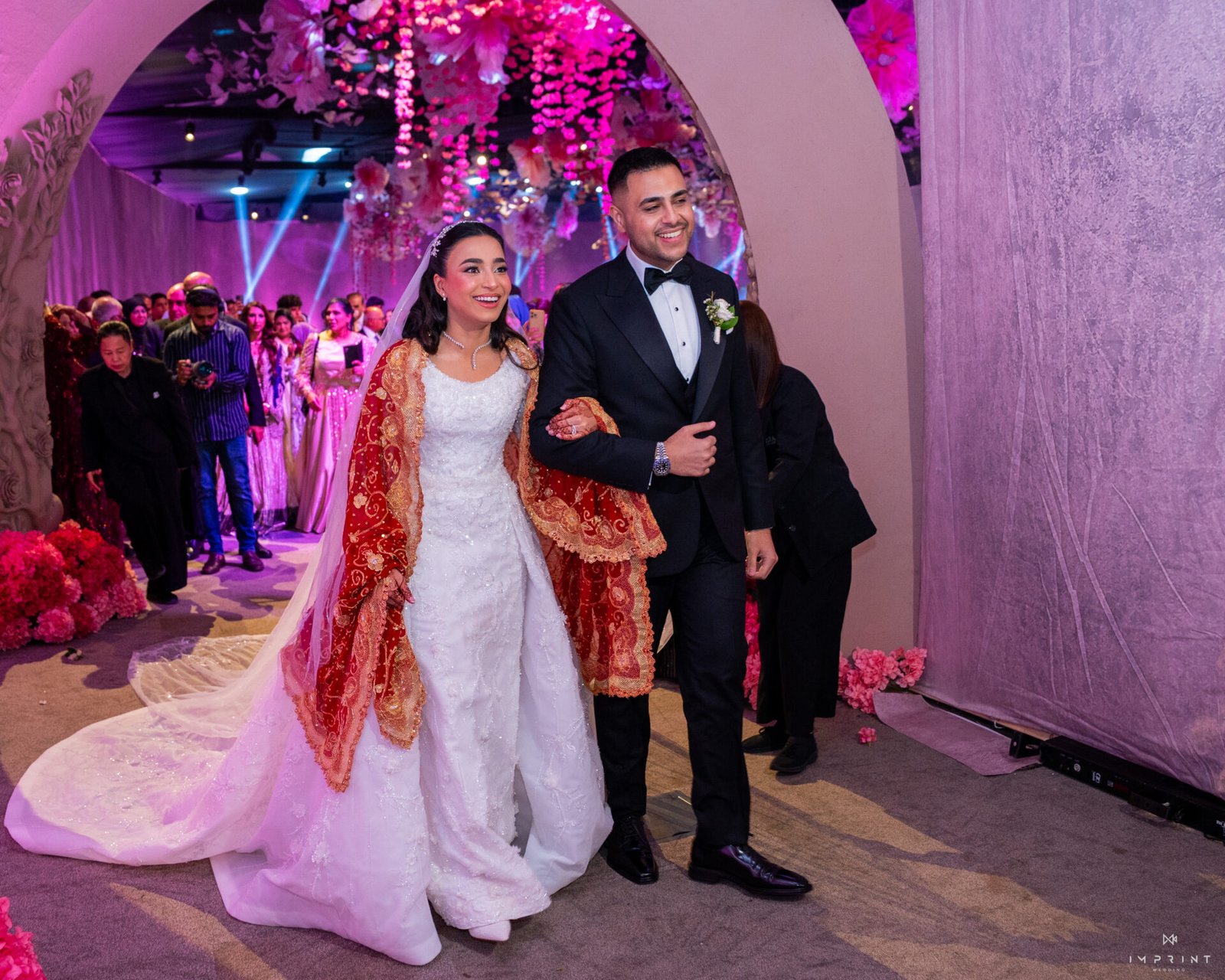 Rimsaa, walking with a calm grace, wore a gown that seemed to move on its own – a long, flowing train that caught the light as if it, too, was trying to sparkle for the night. Ubaid stood tall beside her, the quiet confidence of a groom deeply present in the moment, each step synchronized with hers.
