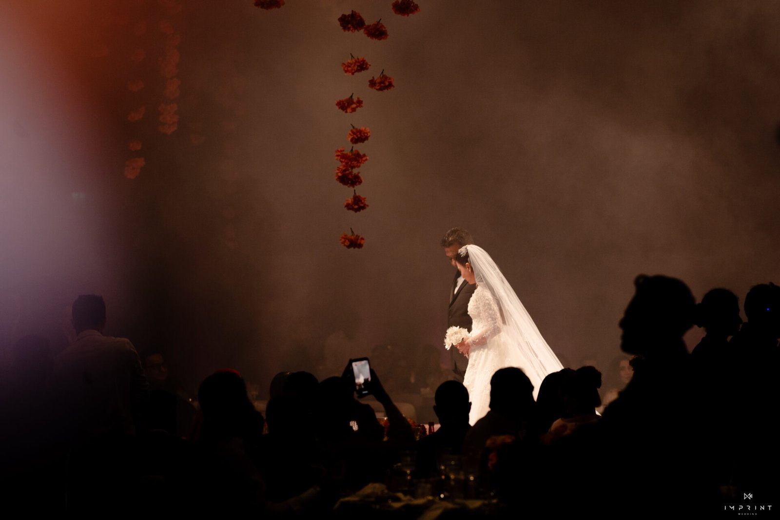 The moment we stepped into the venue, the first thing that met us was a sea of deep crimson florals rising behind the couple’s stage – bold, romantic, dreamlike. It felt less like décor and more like a painting in motion. The lights dipped softly against the red, turning it into a warm glow that wrapped itself around the couple as they entered.